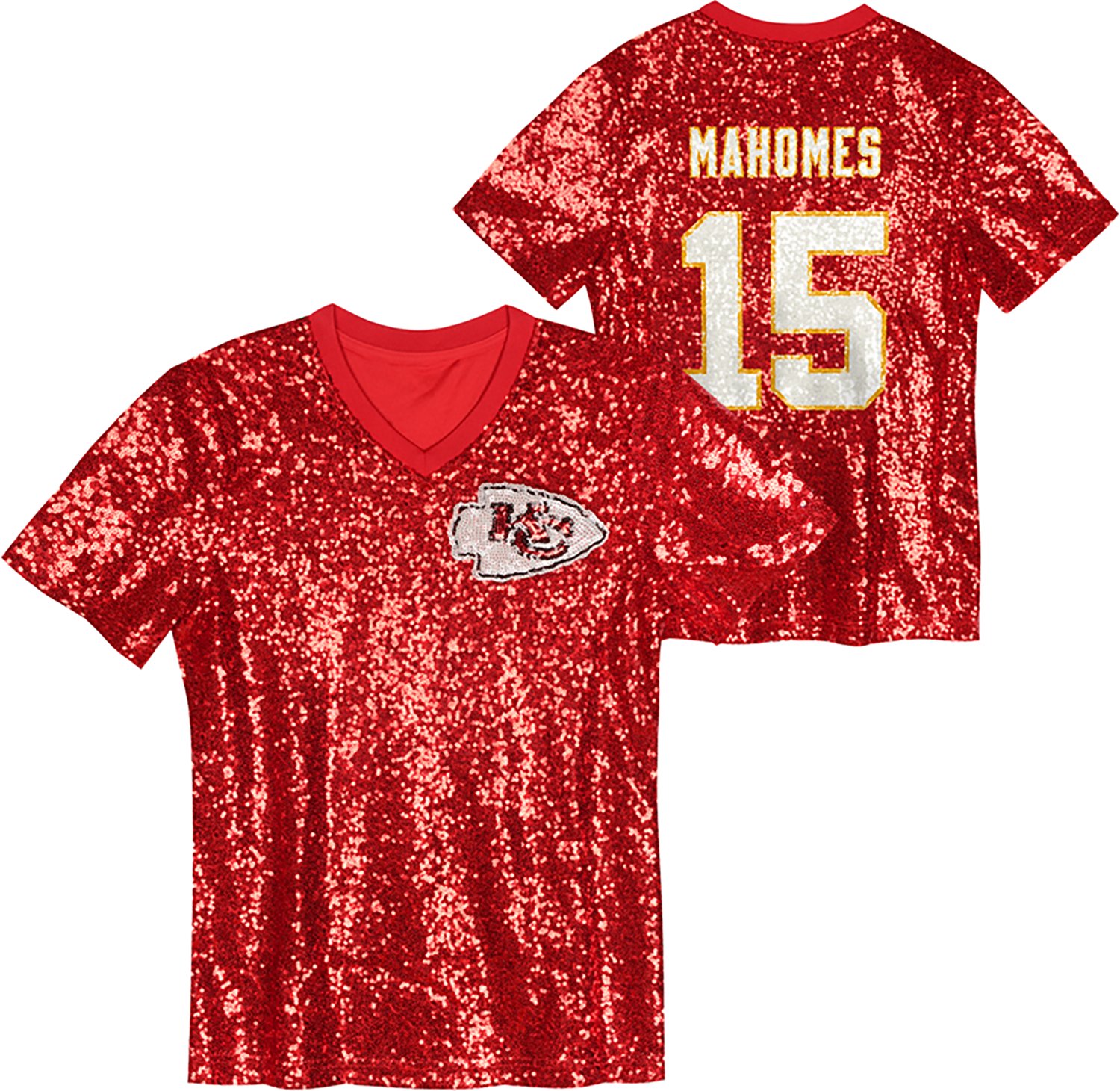 Shine bright while supporting your team in the Outerstuff Women's Kansas City Chiefs Patrick Mahomes N&N Sequin Top. This stylish V-neck features multi-colored sequins for an eye-catching look. Complete with the Chiefs logo on the front and Mahomes' name and number on the back, this top blends fan pride with everyday style. Whether you're at the stadium or watching at home, you'll dazzle with team spirit!
