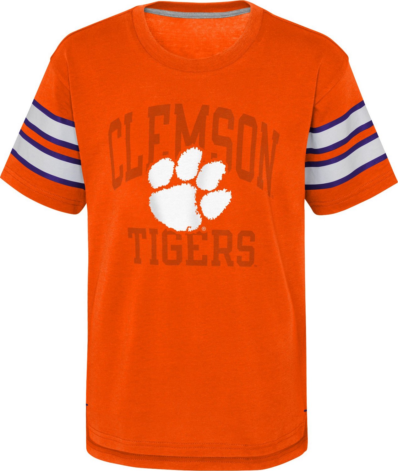 Give your young Tigers fan the Outerstuff Youth Clemson University Team Official T-shirt. This shirt is made of ringspun cotton jersey for comfortable wear. The screen-printed design brings his fan status to the forefront. Short sleeves with stripes.