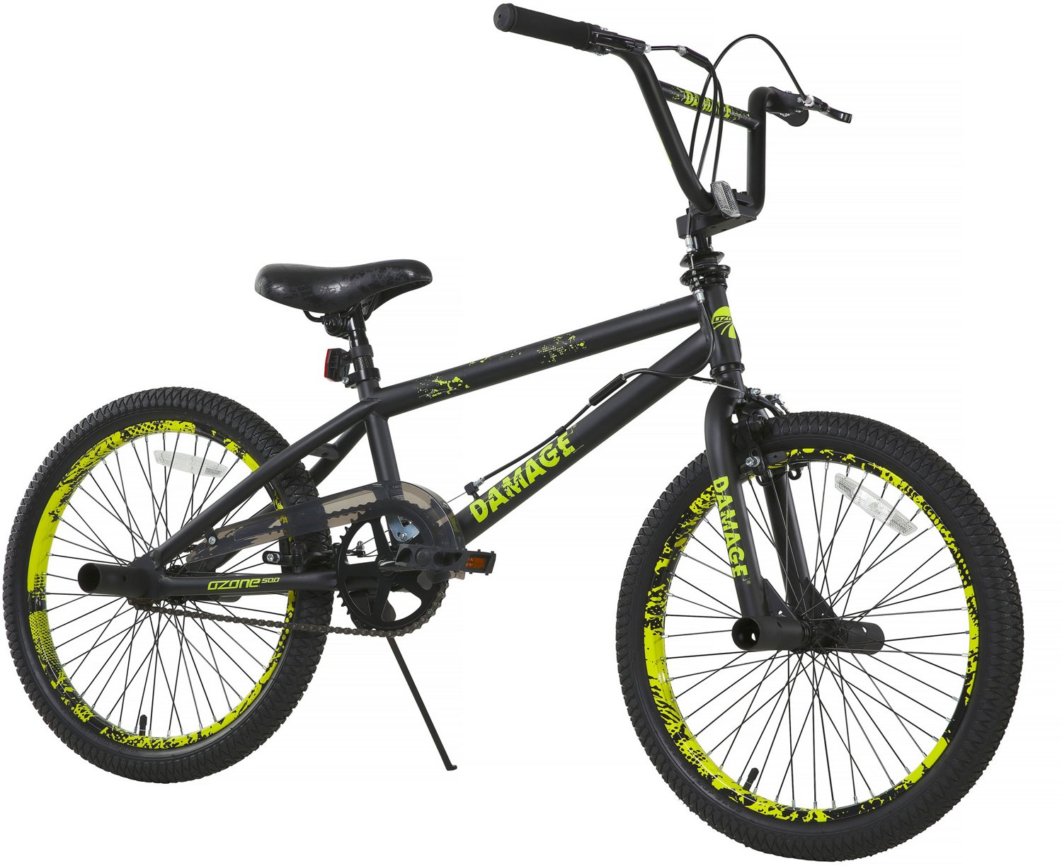 Show off at the skate park with the Ozone 500 Boys' Damage 20 in Bike. Built with a durable steel frame, this bike features 20-inch wheels with steel rims to provide a smooth ride, while the front and rear steel U-brakes allow for reliable stopping. The steel BMX fork lets your perform cool tricks, and the adjustable saddle ensures comfort throughout the ride.