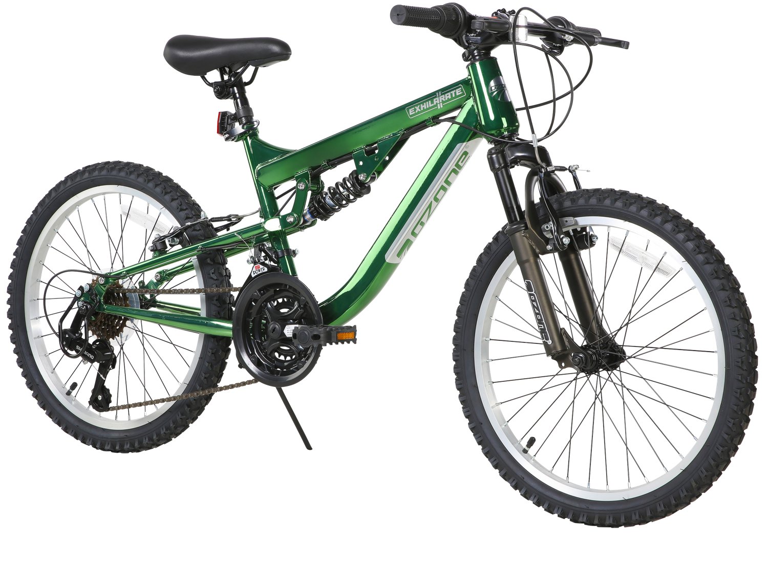 Take on the mountains at your on pace on the Ozone 500 Boys' Exhilarate 20 in 18-Speed Mountain Bike. The 18-speed Shimano rear derailleur with twist grip shifter allows you to navigate different types of terrain, and the alloy rims and larger tires help absorb shock for a comfortable ride. The front and rear V-brakes provide complete stopping power, and the 20-inch steel frame resists wear and tear from the elements.