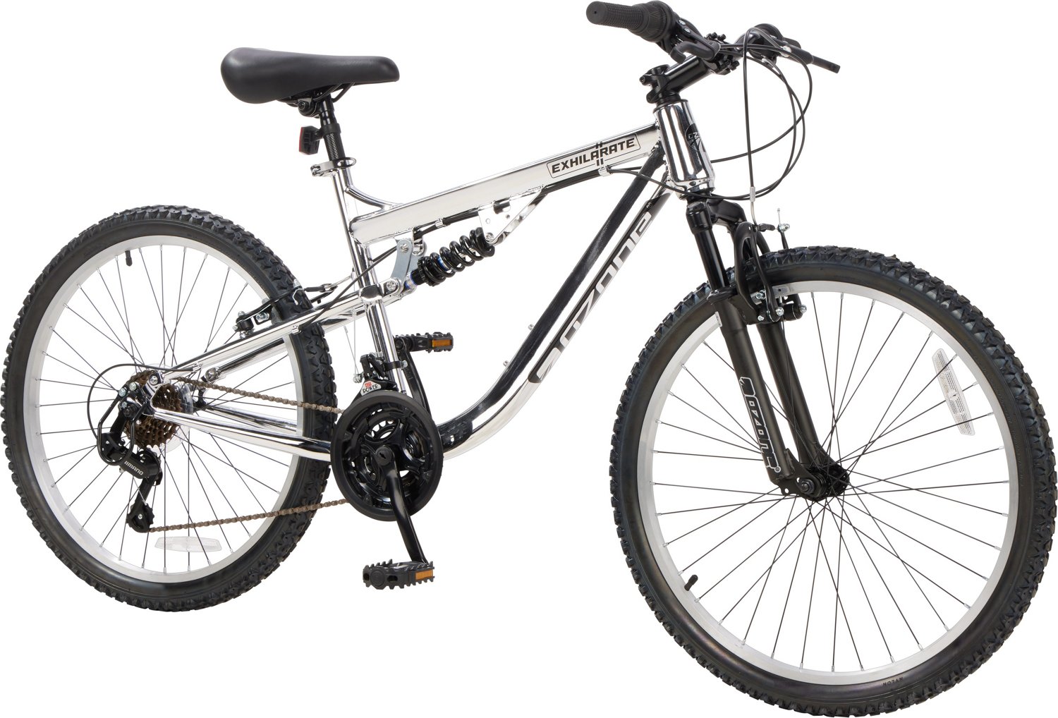 Take on the mountains at your on pace on the Ozone 500 Boys' Exhilarate 24 in Mountain Bike. The Index 18-speed Shimano rear derailleur with twist grip shifter allows you to navigate different types of terrain, and the alloy rims and larger tires help absorb shock for a comfortable ride. The front and rear V-brakes provide complete stopping power, and the 20-inch steel frame resists wear and tear from the elements.