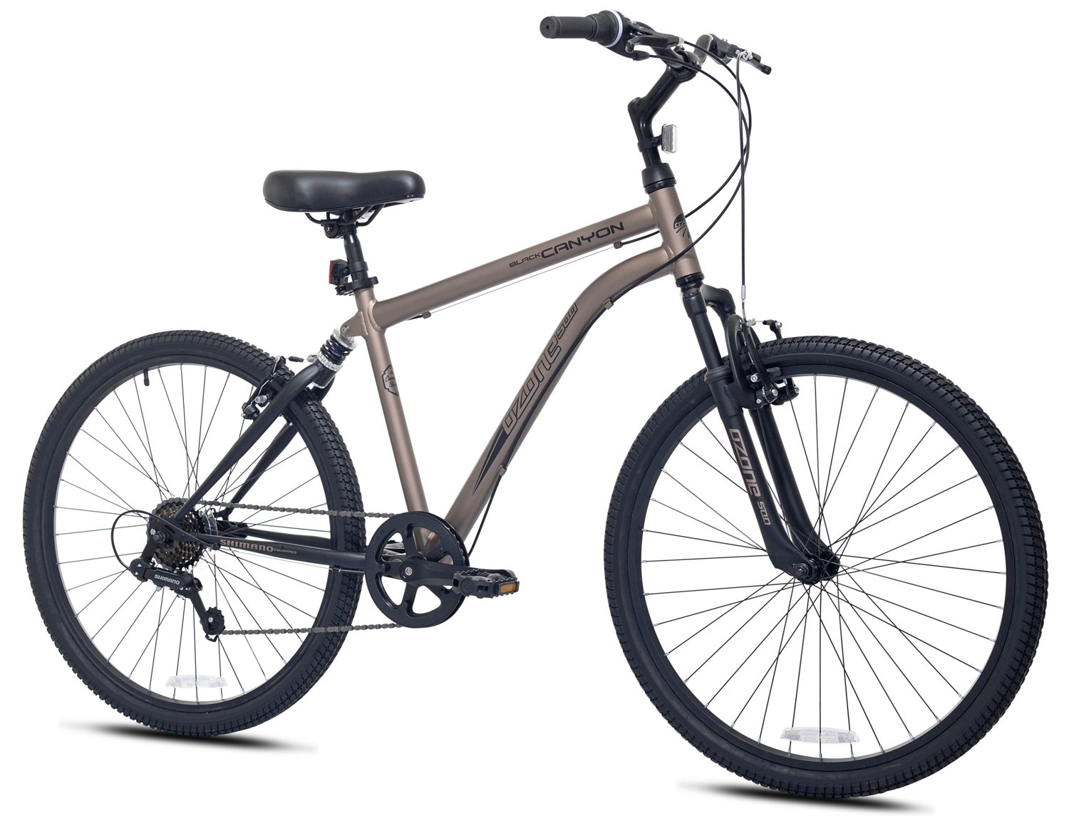 Hop on the Ozone 500 Men's Black Canyon 26 in Bike and enjoy a nice ride. The aluminum frame withstands wear and tear, and the dual suspension and steel fork absorb bumps to keep you comfortable on rocky terrain. A linear pull brake makes sure you stop when you need to, and the seat with a quick-release clamp lets you adjust customize the seat's height to your preference.