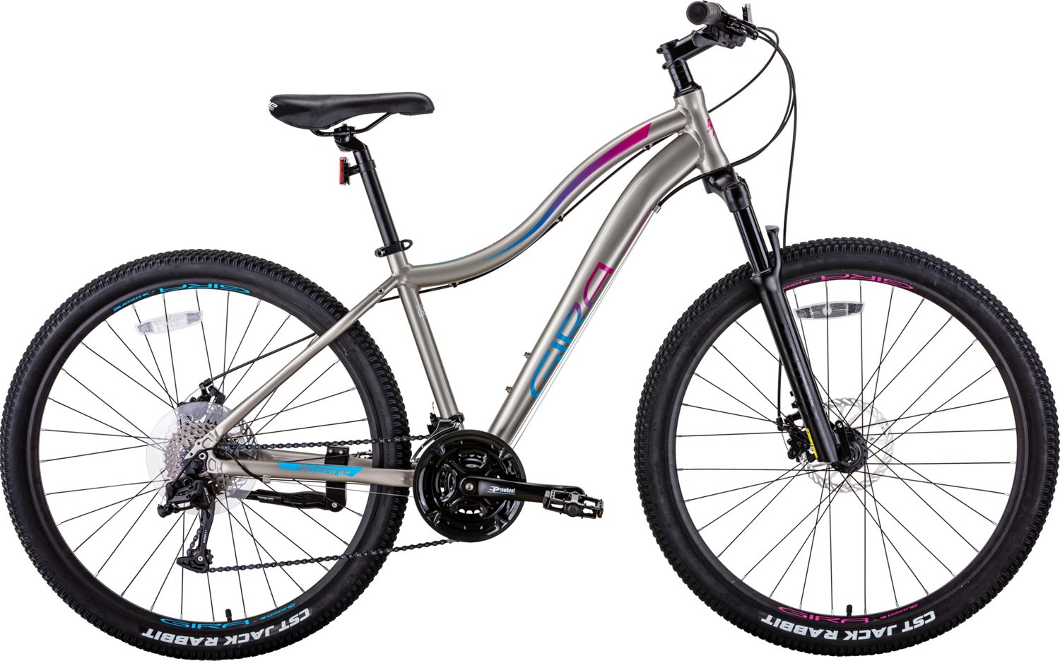 Head off to your next destination on the Ozone 500 Women's Gira Terreno 27.5 in. Mountain Bike. Combining a lightweight aluminum alloy construction and professional geometry frame design, this bike delivers durability and comfort. A full set of Shimano gears and derailleur deliver the comfortable, efficient riding experience you crave.