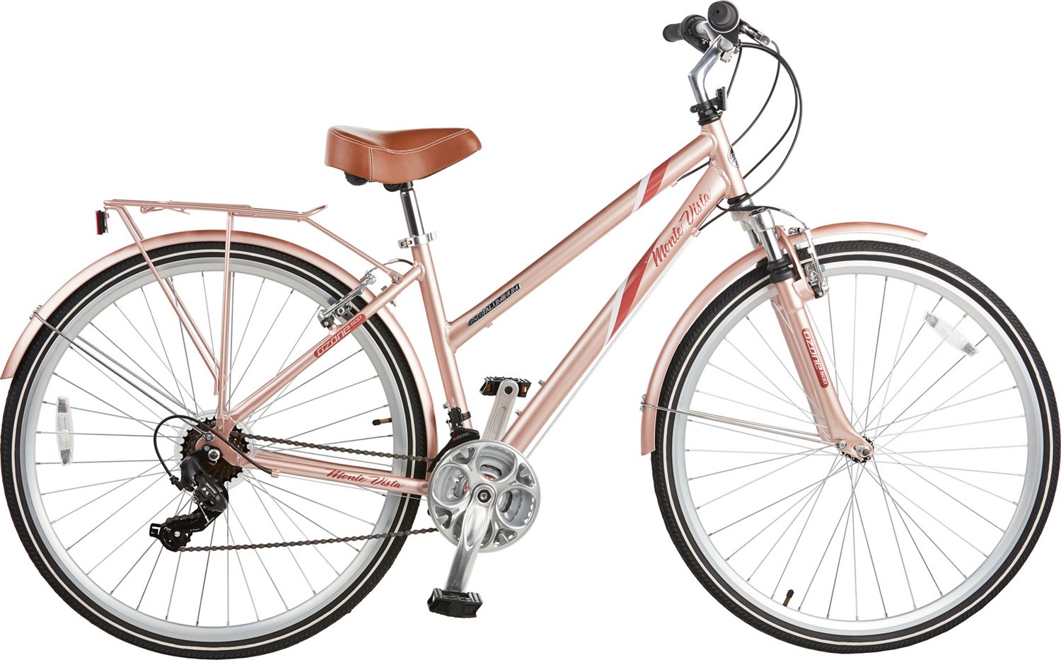 Featuring a Shimano Tourney derailleur, the Ozone 500 Women's Monte Vista 700c 21-Speed Bike allows you to shift effortlessly between 21 speeds to suit your needs. The bike is designed with a ladies' hybrid frame and an aluminum fork for durability, and the 700 x 32c tires and alloy rims provide a smooth ride on a wide range of surfaces.