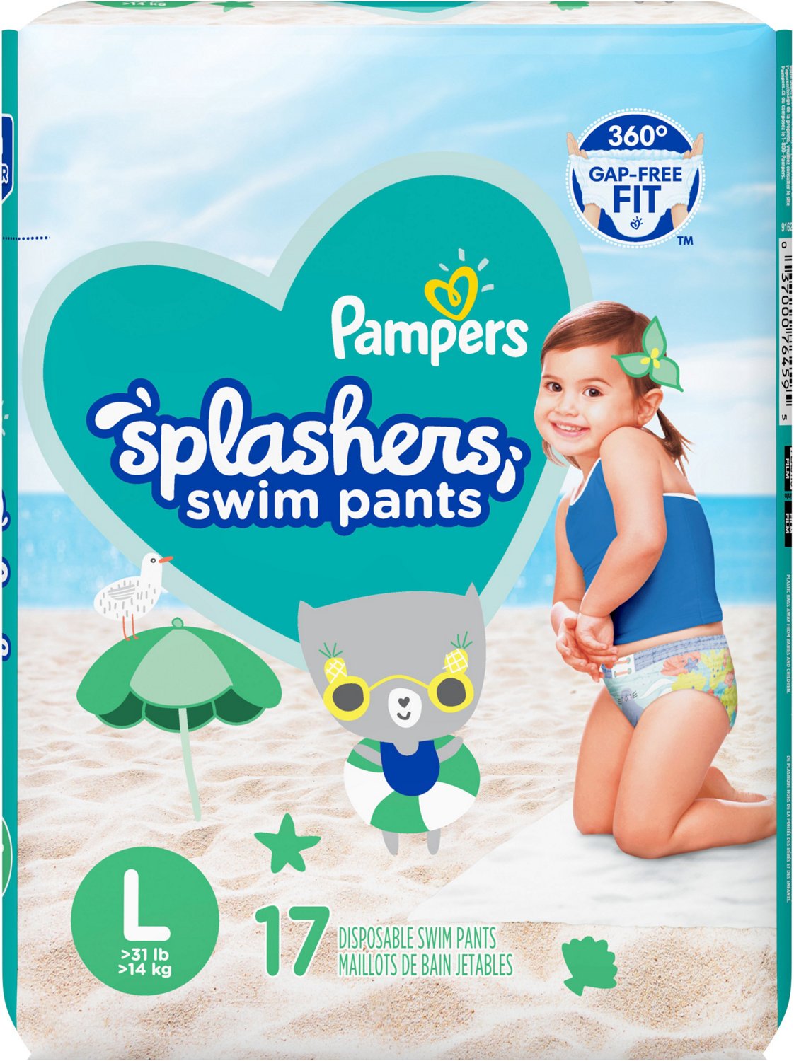 They'll make a splash at the pool with the Pampers Infants' Splashers Jumbo Swim Diapers 17-Pack. The 360 all-around stretchy waistband provides a comfortable fit, while the Dual Leak Guard Barriers protect your baby's legs from messes. The diapers won't swell in water for additional comfort whether wet or dry, and they have easy-tear sides that allow for quick disposal.
