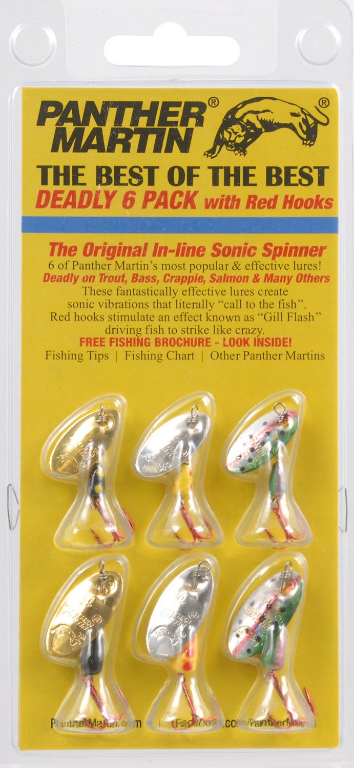 Great for freshwater trout fishing, Panther Martin Best of the Best Lures 6-Pack offer a selection of lure colors and sizes and feature treble hooks. 1" long.