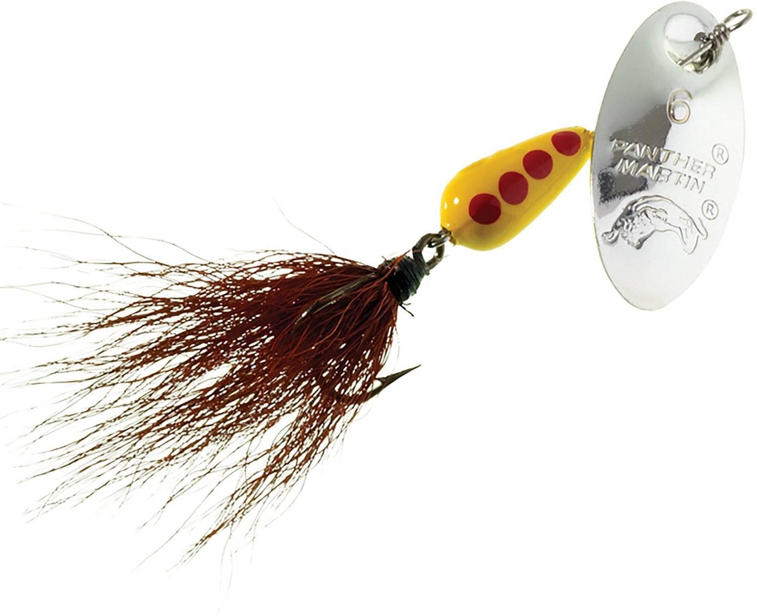 Great for freshwater fishing, the Panther Martin Lure features a blade that spins like an off-center propeller to create hydrosonic waves that attract fish. Colorful design. Treble hook.