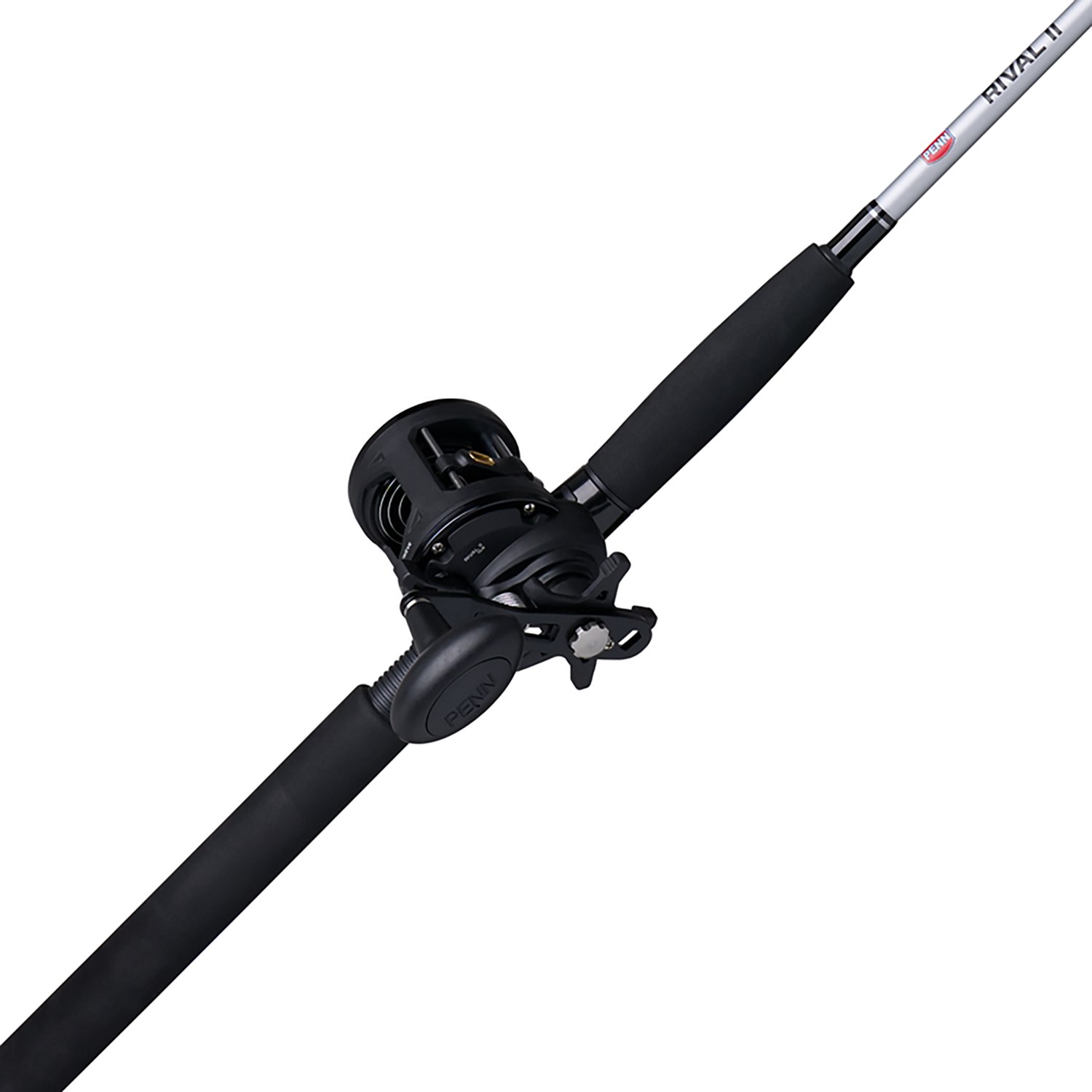Equip your fishing rod with a Penn Rival II 7 ft M Level Wind Combo. The lightweight graphite frame and sideplates afford durability, while the HT-100 carbon fiber drag washers provide smooth consistent drag under pressure. The line capacity rings help anglers keep track of how much line is needed in the spool.