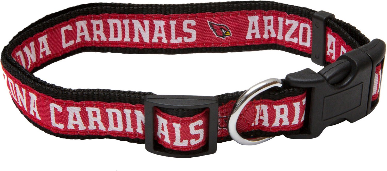 Show your pup's love for the Cardinals with the Pets First Arizona Cardinals Dog Collar. The adjustable buckle provides a comfortable fit, and the silver D ring offers easy attachment for dog tags and leashes. The Cardinals design shows team spirit, while the nylon construction provides long-lasting durability.