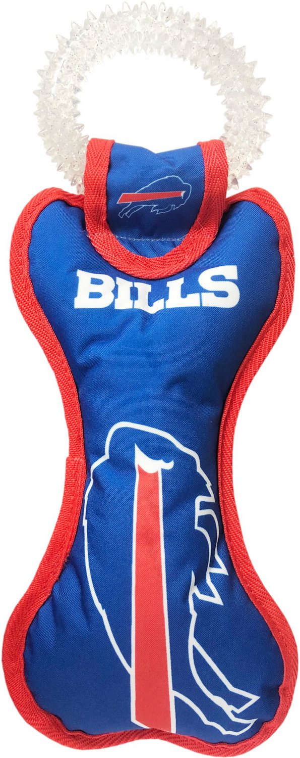 Let your dog enjoy the game with you using the Pets First Buffalo Bills Dental Tug Toy. The screen-printed graphic design displays your your pup's loyalty to the Bills, and the TPR rubber helps ensure oral hygiene. The polyester filling with a rubber squeaker produces a sound when bit.