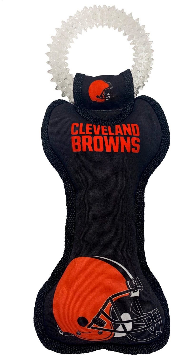 Let your dog enjoy the game with you using the Pets First Cleveland Browns Dental Tug Toy. The screen-printed graphic design displays your your pup's loyalty to the Browns, and the TPR rubber helps ensure oral hygiene. The polyester filling with a rubber squeaker produces a sound when bit.