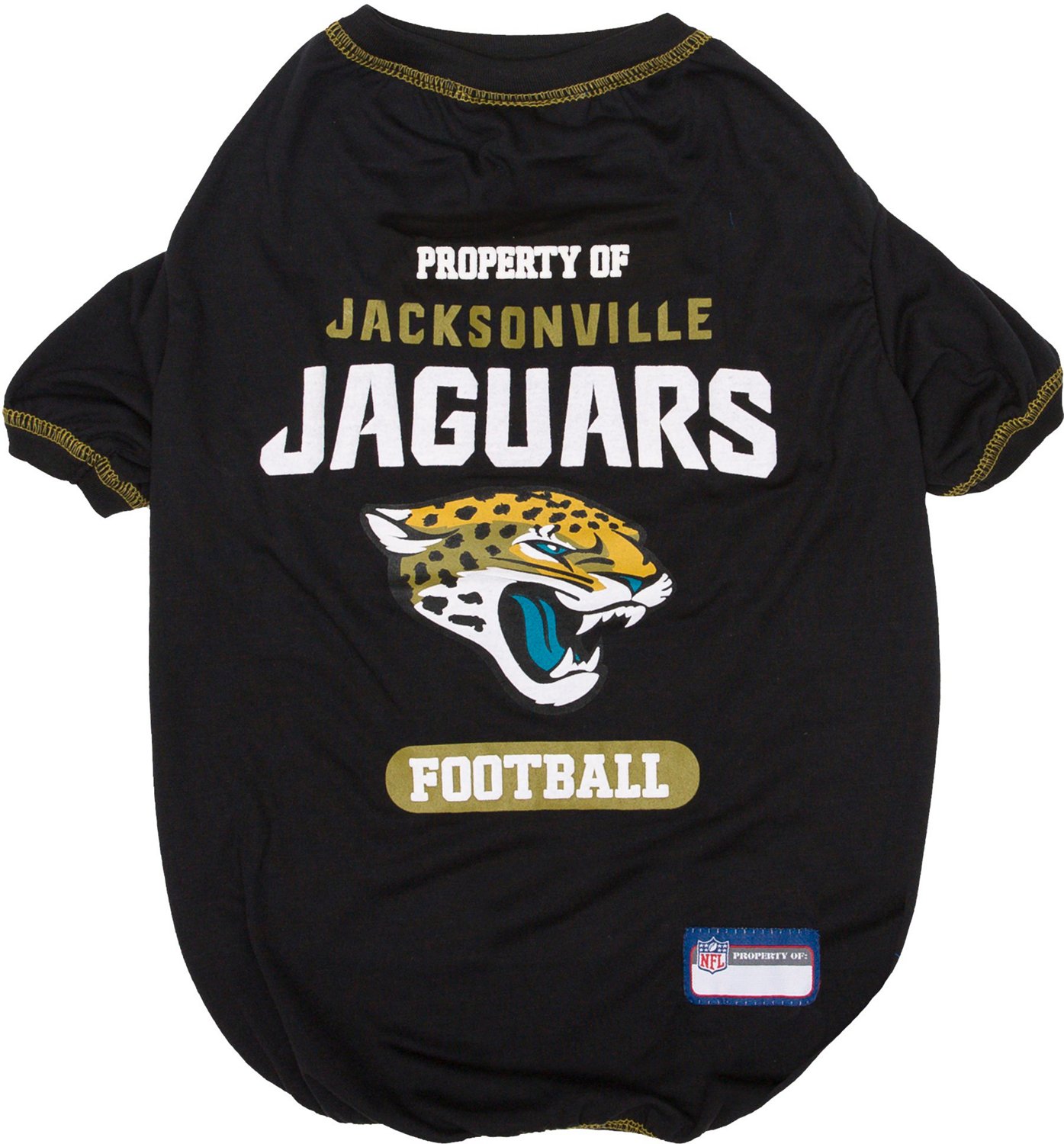Your pet can play like the pros in the Pets First Jacksonville Jaguars Pet T-shirt. This light cotton T-shirt is soft on animals' skin and features an easy fit elastic front panel and bottom band for added comfort. A screen-printed Jacksonville Jaguars graphic puts your fandom on display.