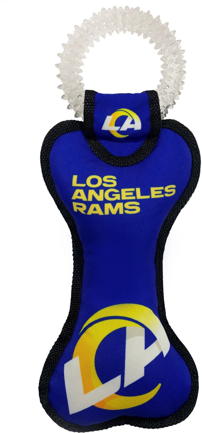 Let your dog enjoy the game with you using the Pets First Los Angeles Rams Dental Tug Toy. The screen-printed graphic design displays your pup's loyalty to the Rams, and the TPR rubber helps ensure oral hygiene. The polyester filling with a rubber squeaker produces a sound when bit.