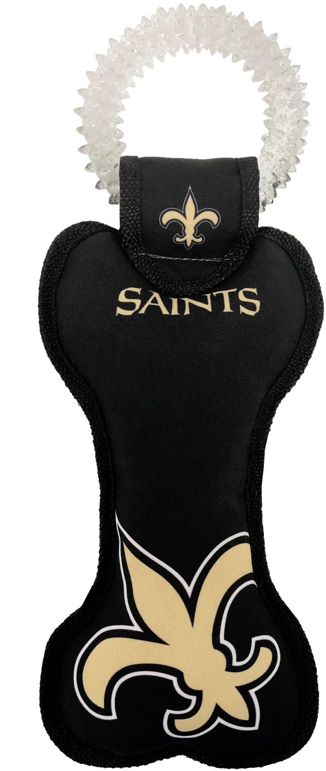 Let your dog enjoy the game with you using the Pets First New Orleans Saints Dental Tug Toy. The screen-printed graphic design displays your your pup's loyalty to the Saints, and the TPR rubber helps ensure oral hygiene. The polyester filling with a rubber squeaker produces a sound when bit.