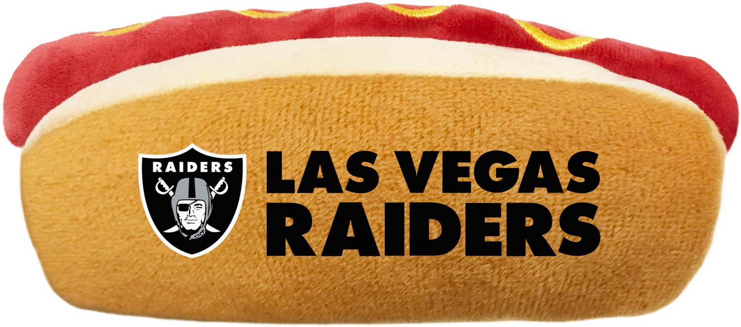 Pets can join in on game day with the Pets First Oakland Raiders Hot Dog Toy. This plush fabric chew toy comes with an internal squeaker for more engaging play, as well as a colorful graphic to celebrate your pet's favorite team.