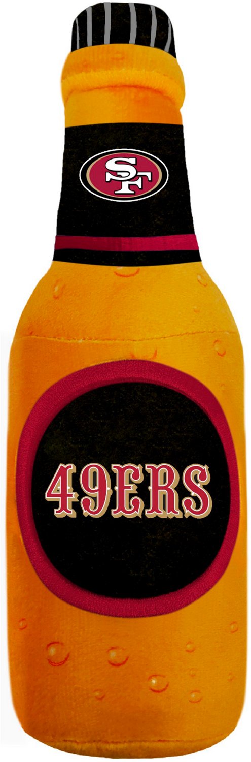 Ensure your dog enjoys the game with you using the Pets First San Francisco 49ers Bottle Dog Toy. The bottle-shaped design displays an appearance of a cold game day beverage, and the team graphics showcase your pup's fandom. The 4 built-in squeakers deliver a sound when bit.