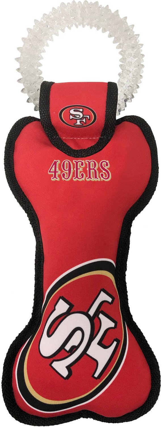 Let your dog enjoy the game with you using the Pets First San Francisco 49ers Dental Tug Toy. The screen-printed graphic design displays your pup's loyalty to the 49ers, and the TPR rubber helps ensure oral hygiene. The polyester filling with a rubber squeaker produces a sound when bit.
