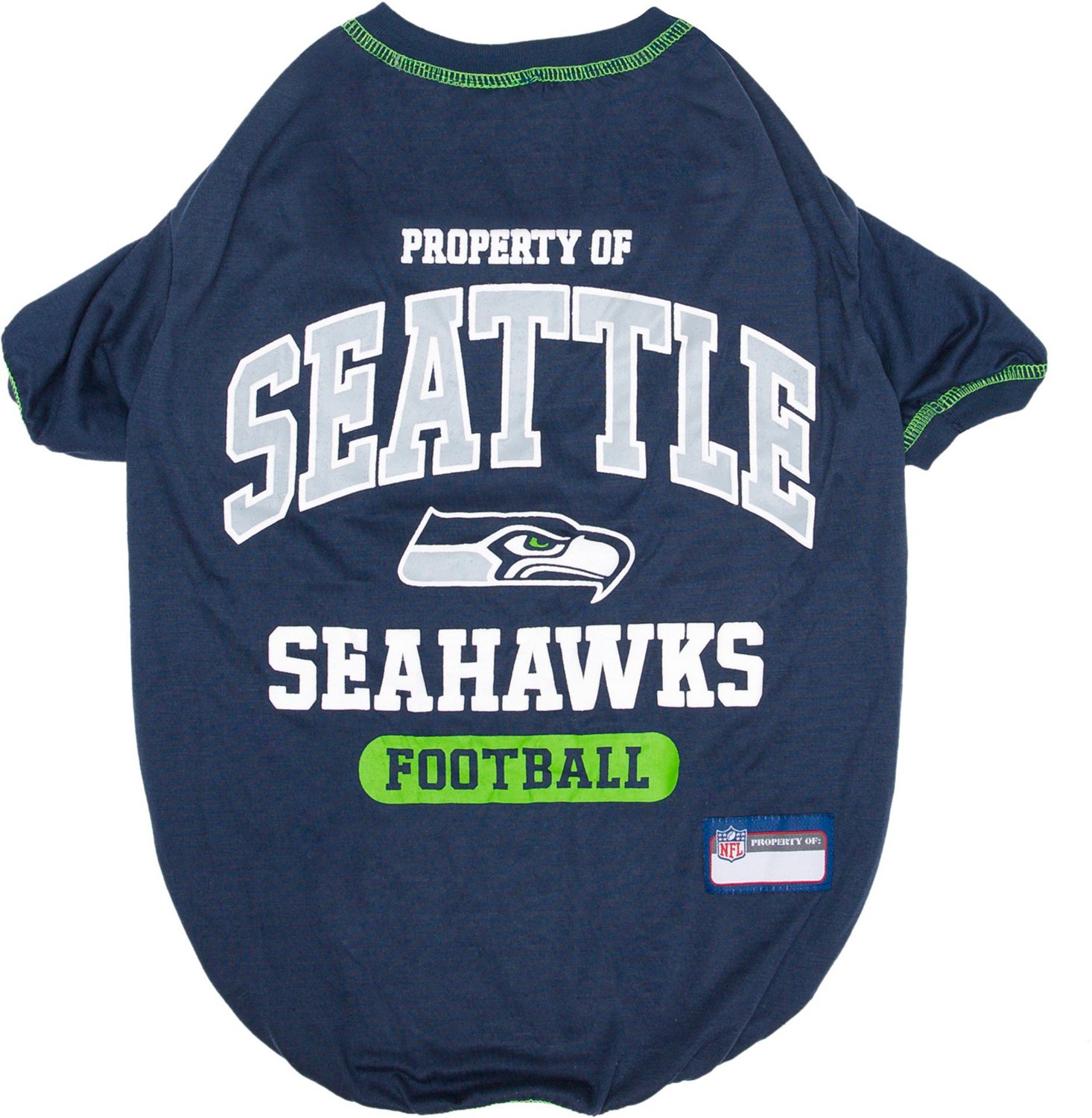 Your pet can play like the pros in the Pets First Seattle Seahawks Pet T-shirt. This light cotton T-shirt is soft on animals' skin and features an easy fit elastic front panel and bottom band for added comfort. A screen-printed Seattle Seahawks graphic puts your fandom on display.