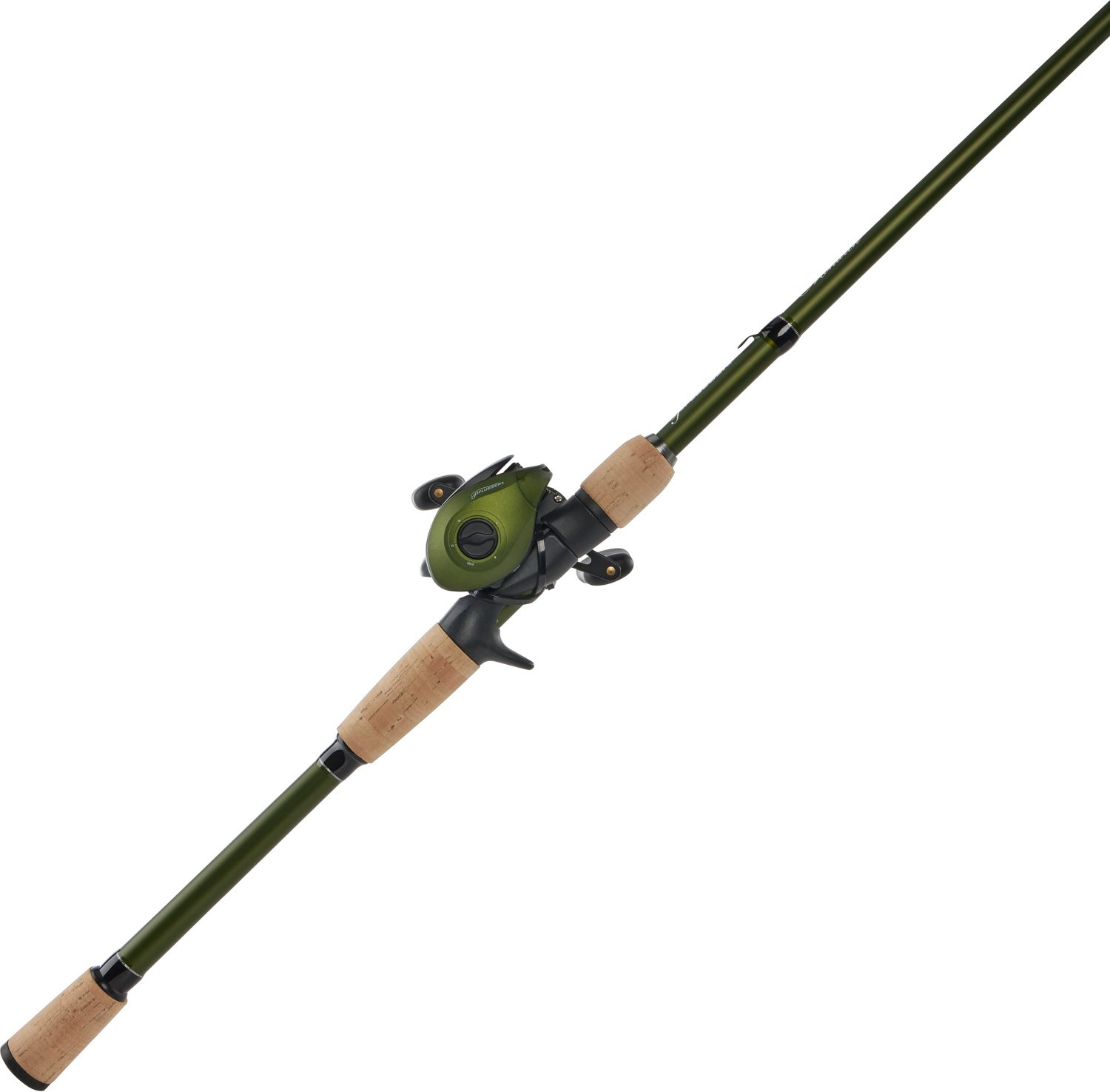 Experience precision and performance with the Pflueger Monarch Baitcast Combo. Featuring 4 stainless steel ball bearings + 1 roller bearing, lightweight graphite frame and sideplate, machined aluminum spool, and an externally adjustable magnetic braking system. Its 90mm bowed aluminum handle with oversized knobs offers comfortable handling, while the lightweight composite blank provides sensitivity and strength. Discover excellence with its lightweight split grip handle design.