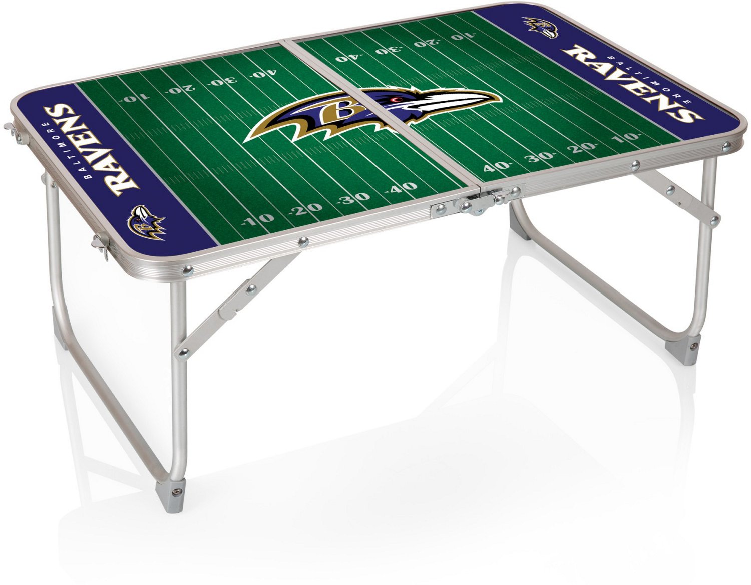 Play cards at the park, serve snacks at the beach and more with the Picnic Time Baltimore Ravens Mini Portable Folding Table. This miniature table is small enough to take anywhere. The fiberboard and aluminum construction is lightweight yet sturdy, and the folding design allows compact storage. The football-themed surface design shows your fandom.