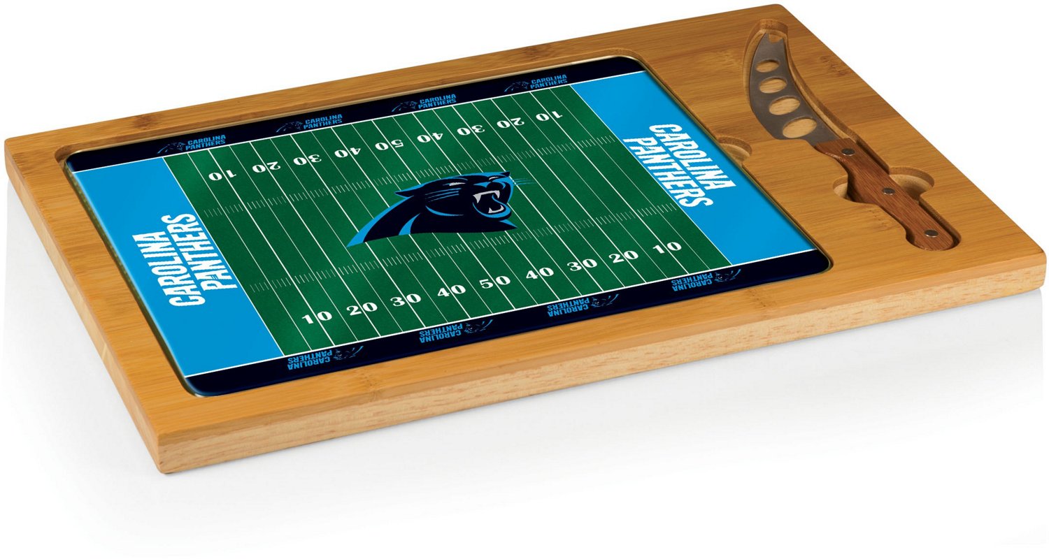 Host the next Panthers watch party at your house and use the Picnic Time Carolina Panthers Icon Glass Top Cutting Board and Knife Set to entertain. The rubber wood base with a bamboo rim accent has an eye-catching aesthetic, and the tempered-glass lid can be used as a cutting board or a serving tray. The team design expresses your fandom.