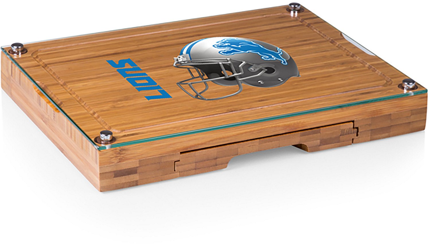 Lay out the snack spread, it's game time with the Picnic Time Detroit Lions Concerto Glass Top Cheese Cutting Board and Tools Set. The bamboo wood construction affords durability, while the 128 square inch surface provides plenty of room for cutting cheese, veggies and meat. Built-in tool storage lets you safely store tools when not in use, and the team graphics show off your Lions pride.
