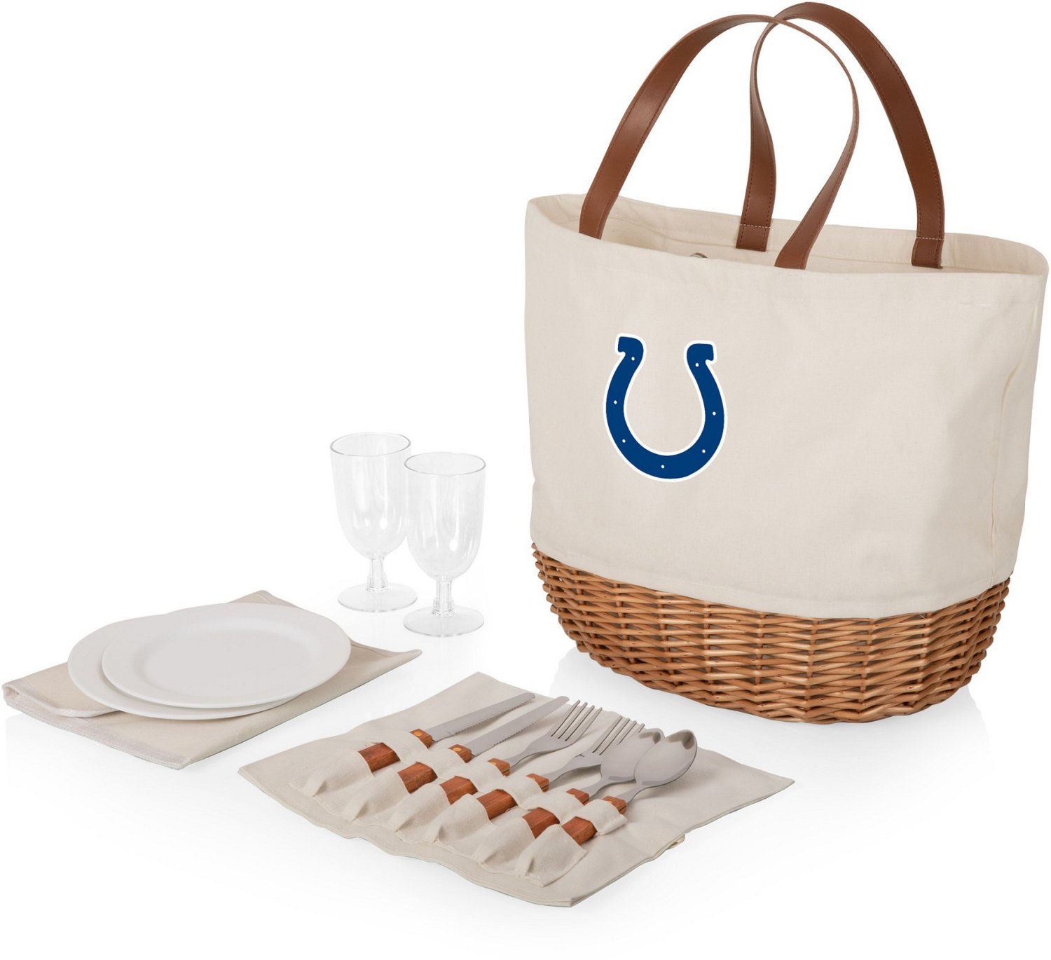The Picnic Time Indianapolis Colts Promenade Picnic Basket Set comes with everything you need for your next picnic. Not only does the set feature a chic canvas picnic tote, but it also comes with cutlery, plates and wine glasses for two people. The spacious interior offers enough room for all the supplies, while still leaving plenty of room for your food and snacks. Complete with an officially licensed team logo, this picnic basket set is perfect for dates, brunches, tailgating parties and more.