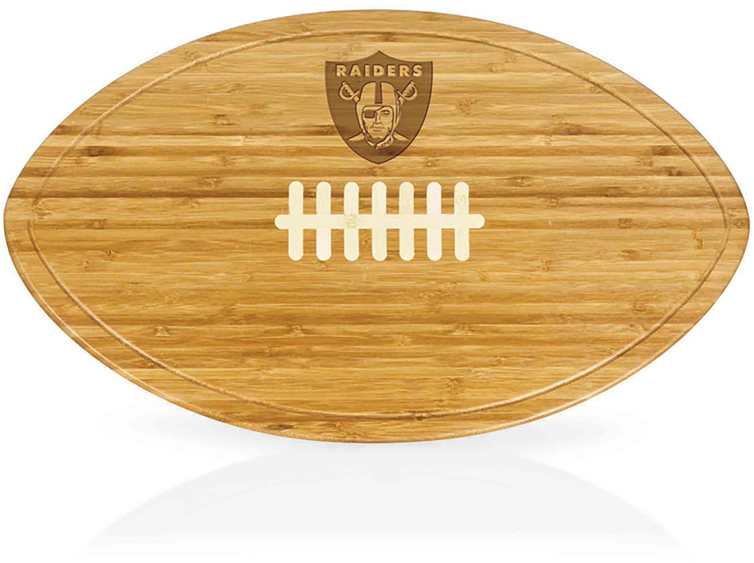 Serve game day snacks with the Picnic Time Las Vegas Raiders Kickoff XL Football Cutting Board and Serving Tray. The bamboo construction affords durability, while the tapered sides offer a firm grip, The 184 square inch surface area provides plenty of prep space, and the team graphics show off your Raiders pride.