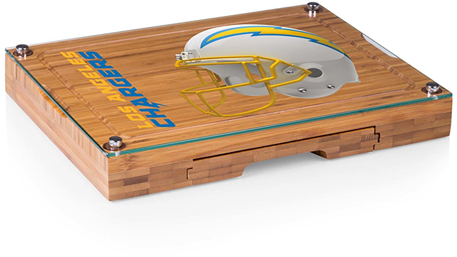 Lay out the snack spread, it's game time with the Picnic Time Los Angeles Chargers Concerto Glass Top Cheese Cutting Board and Tools Set. The bamboo wood construction affords durability, while the 128 square inch surface provides plenty of room for cutting cheese, veggies and meat. Built-in tool storage lets you safely store tools when not in use, and the team graphics show off your Chargers pride.