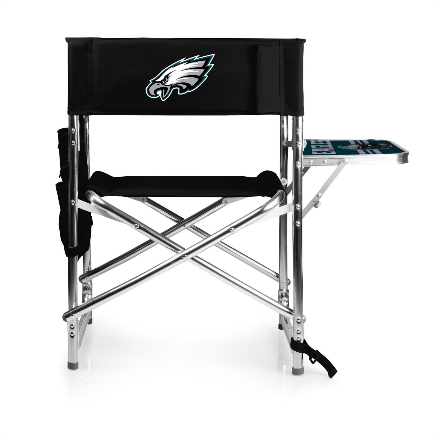 Get ready for your next tailgate with the Picnic Time Philadelphia Eagles Sports Chair with Side Table. The durable polyester seat and back are emblazoned with a large team logo to show your team allegiance. An armrest caddy keeps your belongings handy, and a fold-out side table allows for easy snacking. The folding design, shoulder strap and 2 carry handles make transport easy.