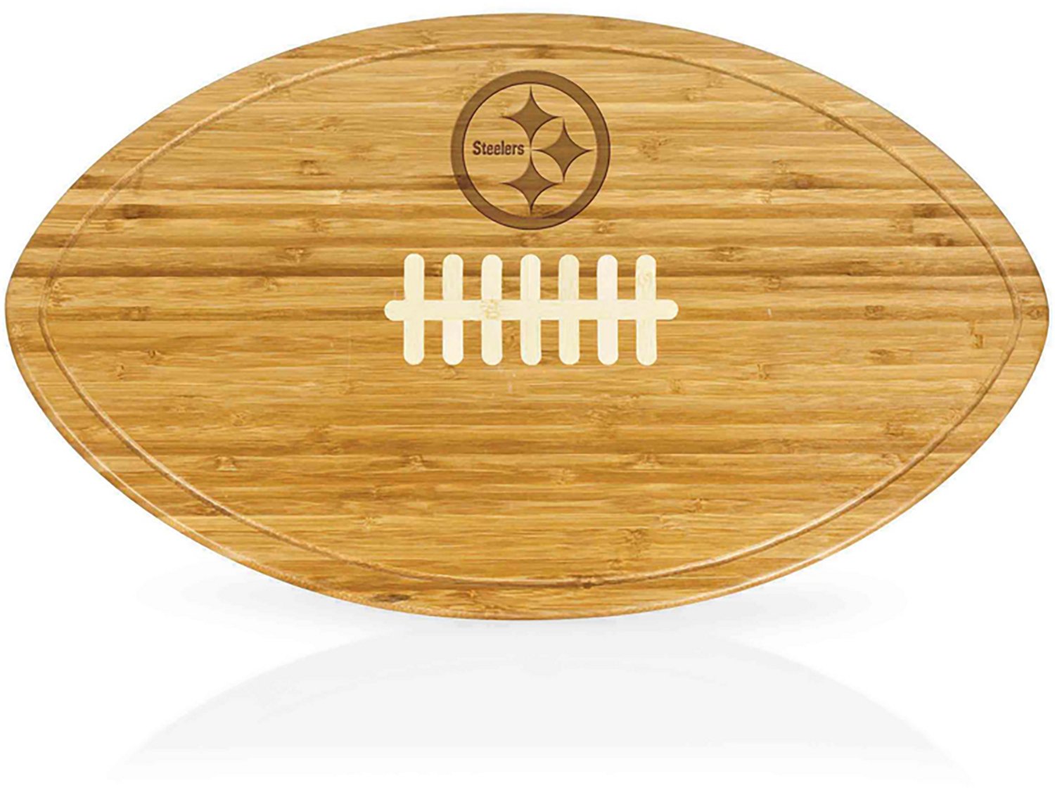 Serve game day snacks with the Picnic Time Pittsburgh Steelers Kickoff XL Football Cutting Board and Serving Tray. The bamboo construction affords durability, while the tapered sides offer a firm grip, The 184 square inch surface area provides plenty of prep space, and the team graphics show off your Steelers pride.