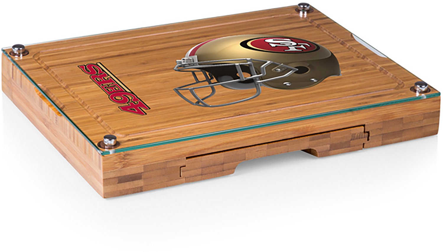 Lay out the snack spread, it's game time with the Picnic Time San Francisco 49ers Concerto Glass Top Cheese Cutting Board and Tools Set. The bamboo wood construction affords durability, while the 128 square inch surface provides plenty of room for cutting cheese, veggies and meat. Built-in tool storage lets you safely store tools when not in use, and the team graphics show off your 49ers pride.