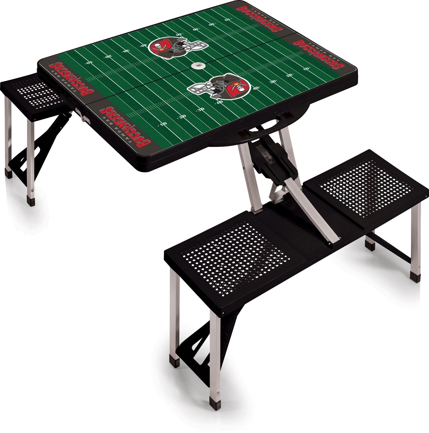 Enjoy an epic tailgate party or a backyard barbecue with the Picnic Time Tampa Bay Buccaneers Portable Picnic Table. The table features durable aluminum alloy and ABS plastic construction, and the 4 basket-weaved seats can each support up to 250 pounds. The collapsible design offers easy setup and transport, while the digital printed team graphics show off your Buccaneers fandom.