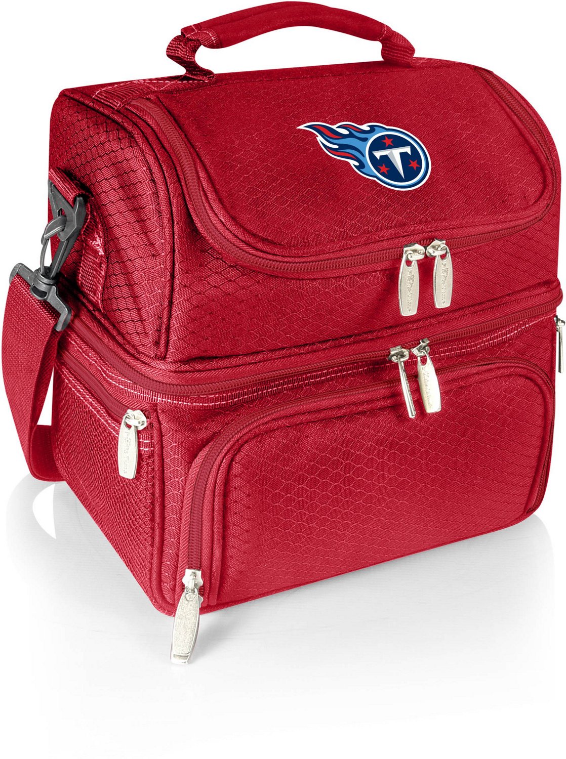 Take your NFL fandom to lunch whenever you carry the Picnic Time Tennessee Titans Pranzo Lunch Tote. The insulated polyester construction helps keep your food items fresh, while the digital printed team logo graphic displays your Titans loyalty. The tote comes with stainless-steel utensils, frosted glass salt and pepper shakers and a 100% cotton napkin.