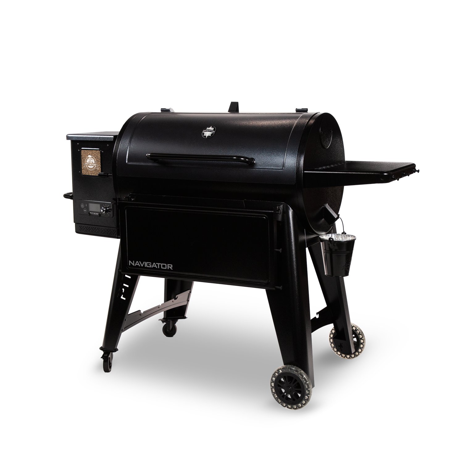 Get your grill on with the Pit Boss Navigator 1000 Wood Pellet Grill. Its 1,159 square inch cooking area holds approximately 46 burgers. The 2 adjustable cooking grids are made from porcelain-coated cast iron are easy to maintain, and its Flame Broiler™ Lever allows for direct flame searing up to 1,000°F. The grease management system consists of a simple steel bucket.