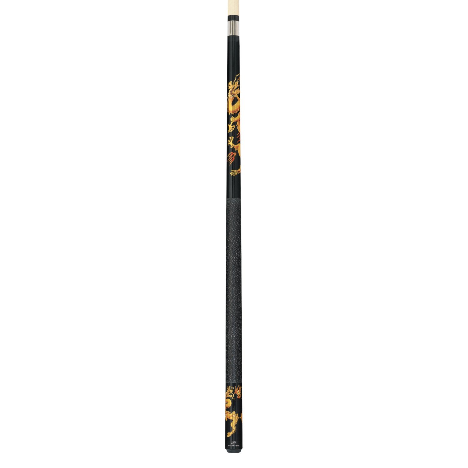 The Players 2-Piece Pool Cue is made with a midnight black forearm and butt sleeve with golden Chinese luck dragon graphic, stainless-steel joint collar and genuine black-and-white double-pressed Irish linen wrap.