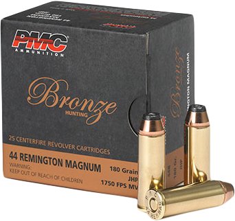 The PMC Bronze Handgun .44 Remington .22 Win Magnum Rimfire Ammunition - 50 Rounds features a jacketed hollow-point design. 1,400 fps muzzle velocity. 783 ft.-lb. muzzle energy.