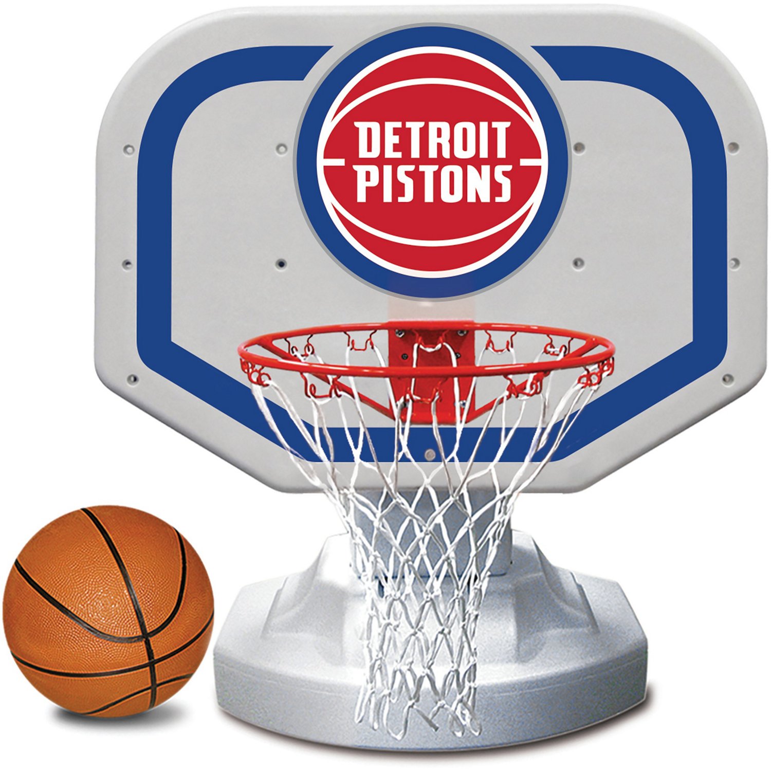 The Poolmaster® Detroit Pistons Competition Style Poolside Basketball Game features a Polyform backboard, a 16" aluminum hoop with a polyethylene net and Pistons graphics. Includes a 9" game ball and an inflating needle. Find this and other NBA accessories at Academy.com.