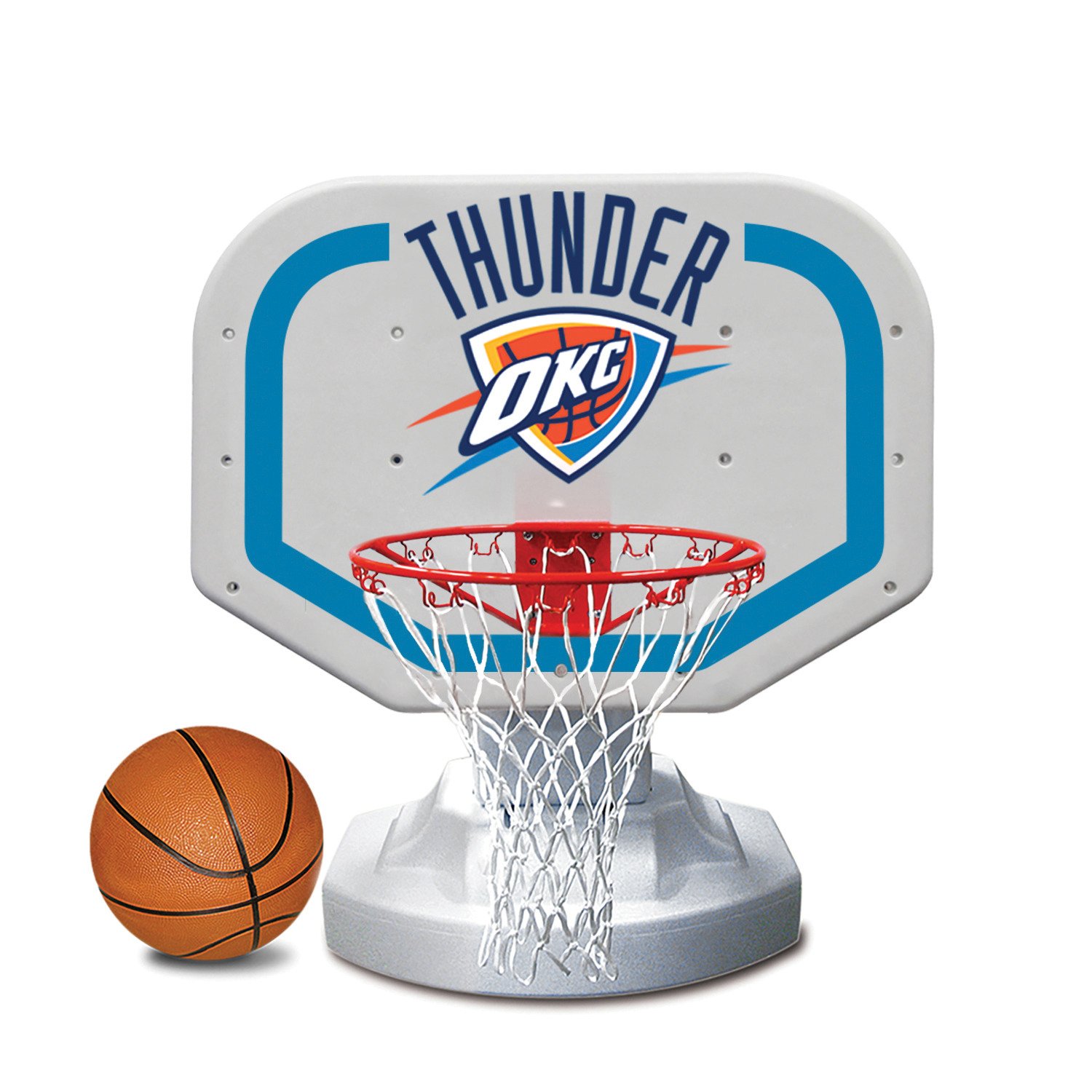 The Poolmaster® Oklahoma City Thunder Competition Style Poolside Basketball Game features a Polyform backboard, a 16" aluminum hoop with a polyethylene net and Thunder graphics. Includes a 9" game ball and an inflating needle. Find this and other NBA accessories at Academy.com.