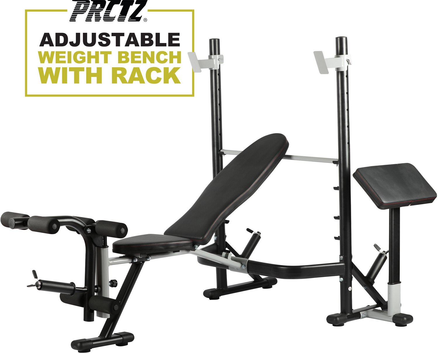 Rack up the gains with the PRCTZ Adjustable Weight Bench with Olympic Squat Rack, Arm and Leg Developer, and Preacher Pad. This workout system is ideal for at home muscle building and strength training. The design allows for the performance of a wide variety of upper and lower body exercises. The high quality steel tubing offers durability and supports up to 300 pounds, while the built-in storage helps keep your weight and grip plates organized.