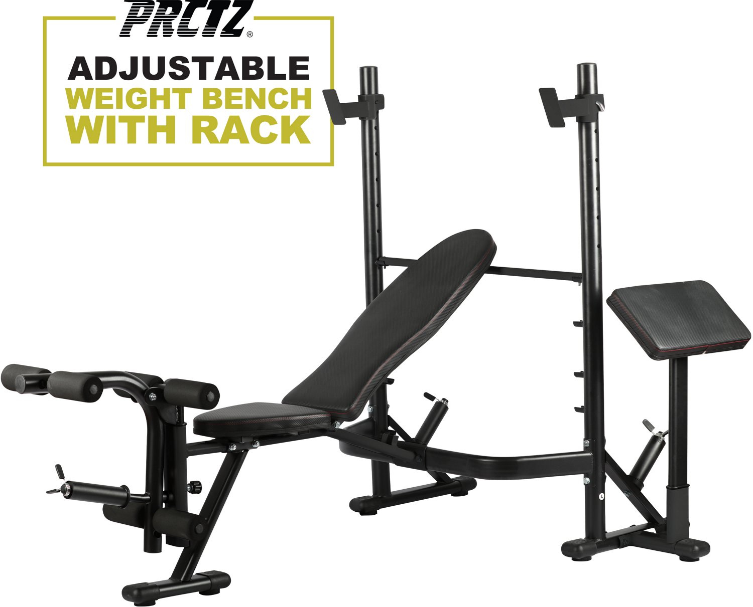 Complete your home routine with the PRCTZ Adjustable Weight Bench and Squat Rack. This full-body bench offers a wide range of strength exercises with weights, a detachable leg developer and a preacher curl pad, and it can transform into a station for squats and powerlifting. The high-quality steel supports users up to 300 pounds, and integrated spotters keep your routine safe.