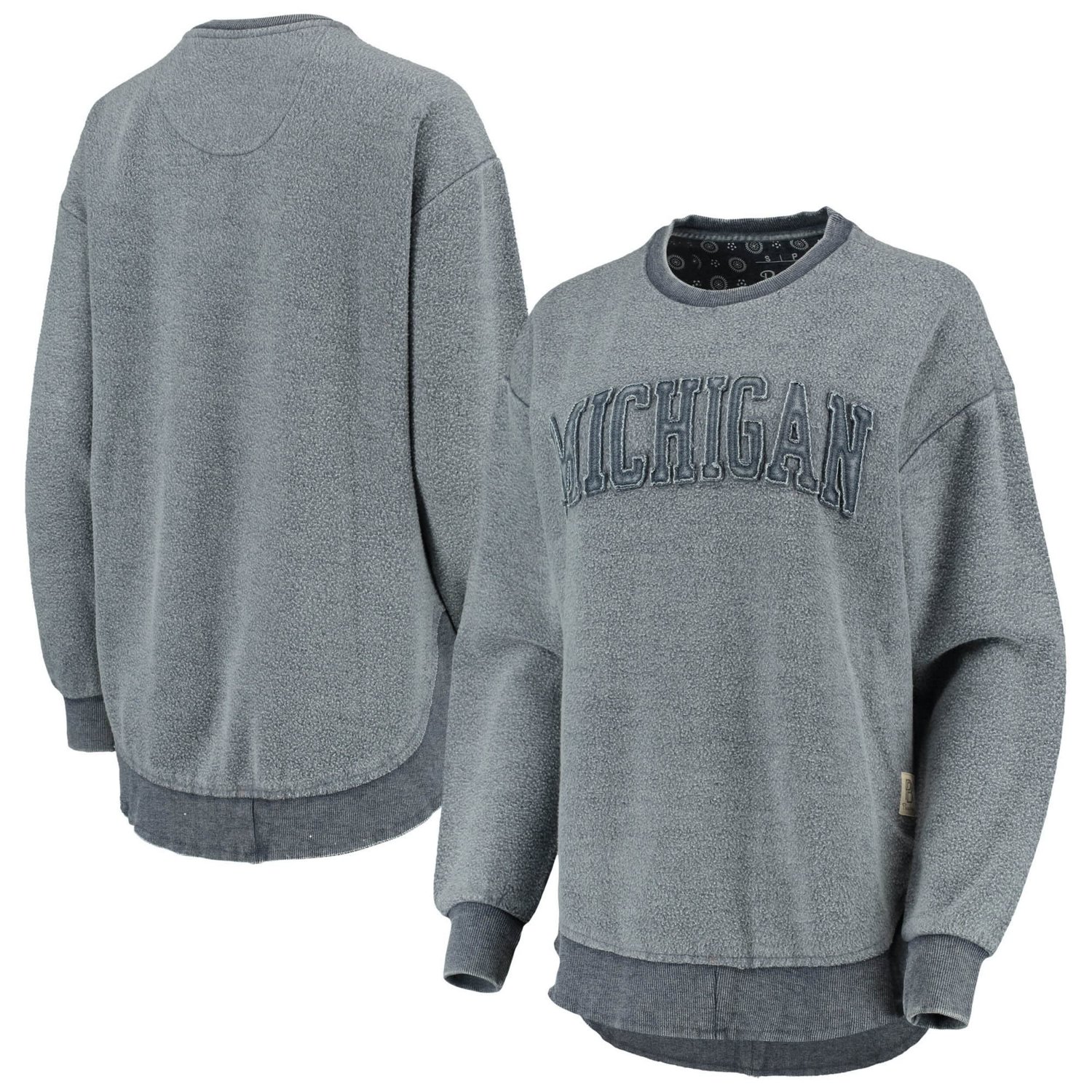 The Women's Pressbox Navy Michigan Wolverines Ponchoville Pullover Sweatshirt is the perfect way to show your support for the Michigan Wolverines Made from a comfortable cotton and polyester blend this midweight sweatshirt is suitable for moderate temperatures The pullover design makes it easy to layer up or down and the rounded droptail hem with raw edge adds a touch of style Stitched fabric appliques with raw edge proudly display your Michigan Wolverines pride and the washed-out fabric gives it a vintage look
