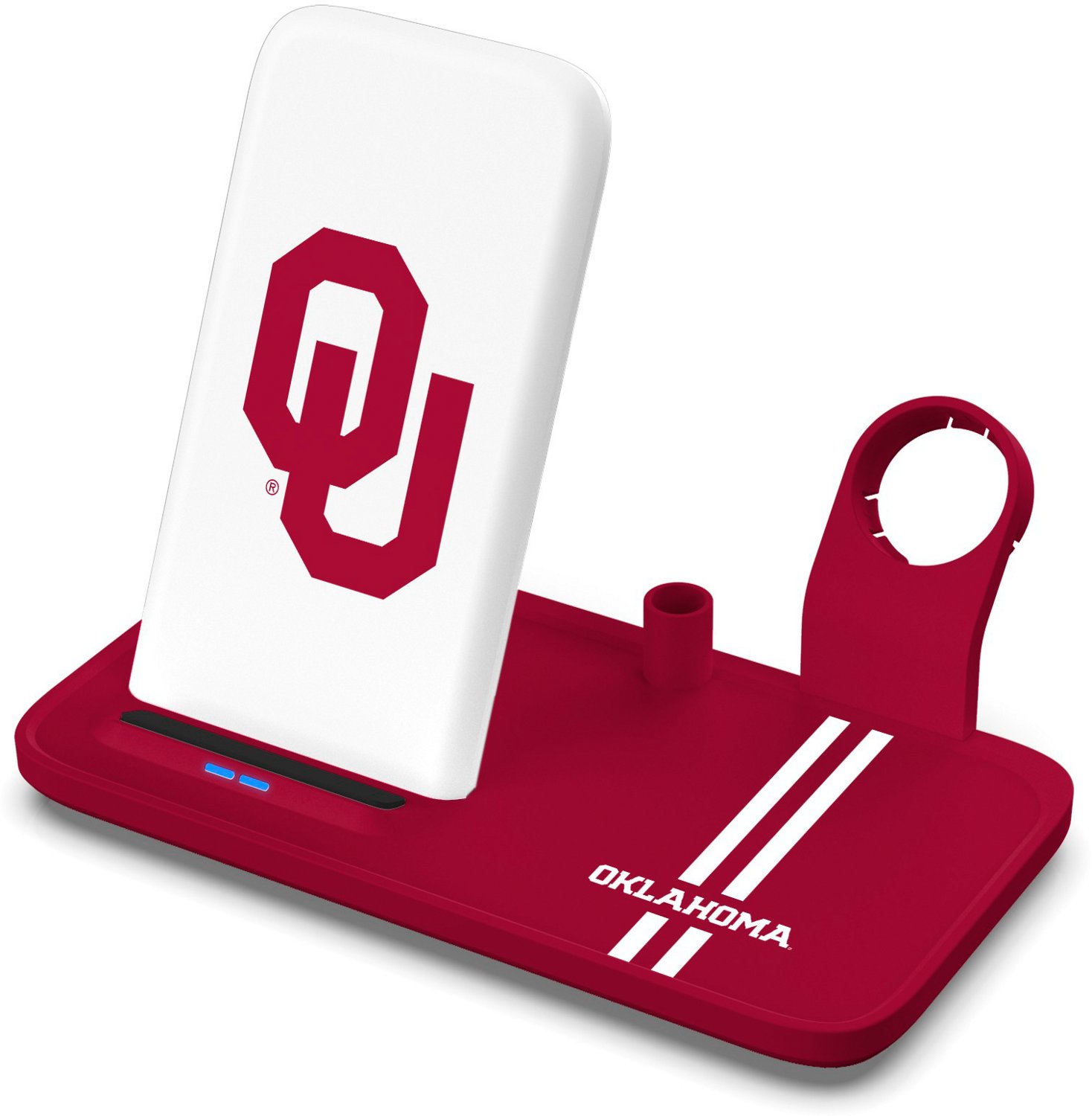 Stay fully charged in Sooners style with the Prime Brands Group University of Oklahoma Wireless Charging Station. The 4-in-1 design provides connections to keep all of your equipment charged, while the Oklahoma design highlights your team pride. The wireless design offers convenient connections and placement.
