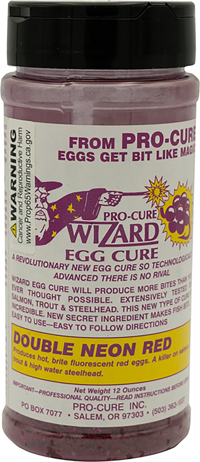 Lure in your next catch with the Pro Cure Wizard Double Neon Red 12 oz. Egg Cure. It attracts salmon, trout, and high water steelhead. The unique curing formula is loaded with a complex blend of amino acids that get fish to feed aggressively, and its hottest, brightest fluorescent color available improves temptation.