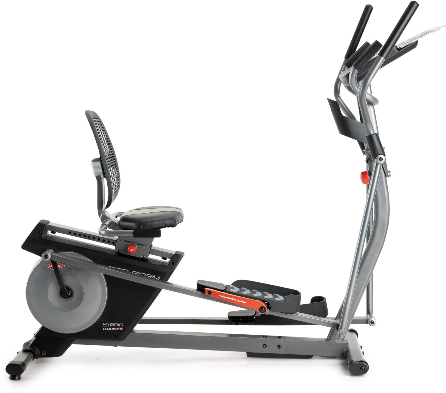 Adjustable cushioned pedals encourage easy transitions from elliptical to recumbent bike