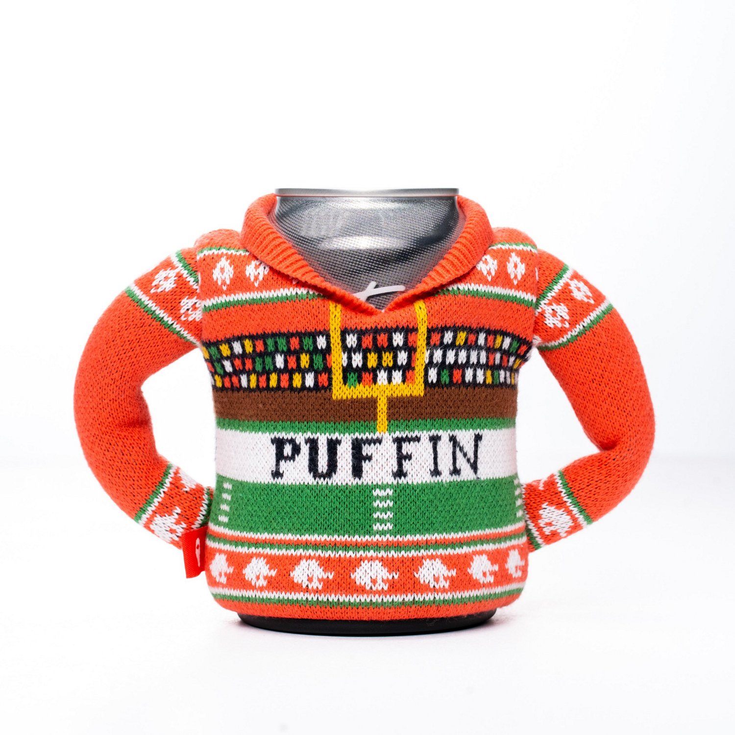 Keep your drink cold with the Puffin Drinkware The Sweater Can Cooler. The ugly sweater design provides a fun look, and the cooler fits around 12 ounce drinks for your convenience.