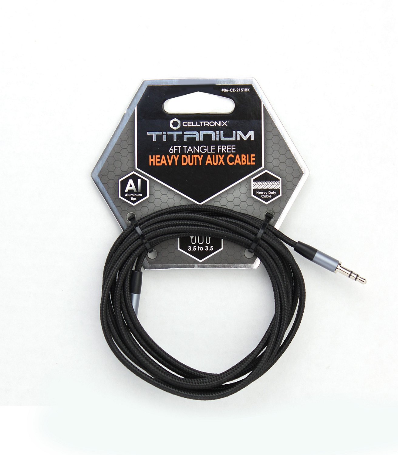 Plug in the PUGS Celltronix Titanium Auxiliary 6 ft Braided Cable, which features aluminum tips. The nylon cable helps prevent tangling and works with a variety of electronics.