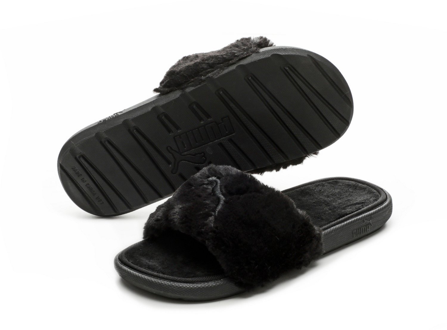 Stay comfortable all day with the PUMA Women's Fluffy Cool Cat Slides. These slides feature faux fur material uppers with cat embroidered branding for a cool and comfy look. The faux fur footbeds provide added comfort, while the light molded EVA outsoles allow for durability.