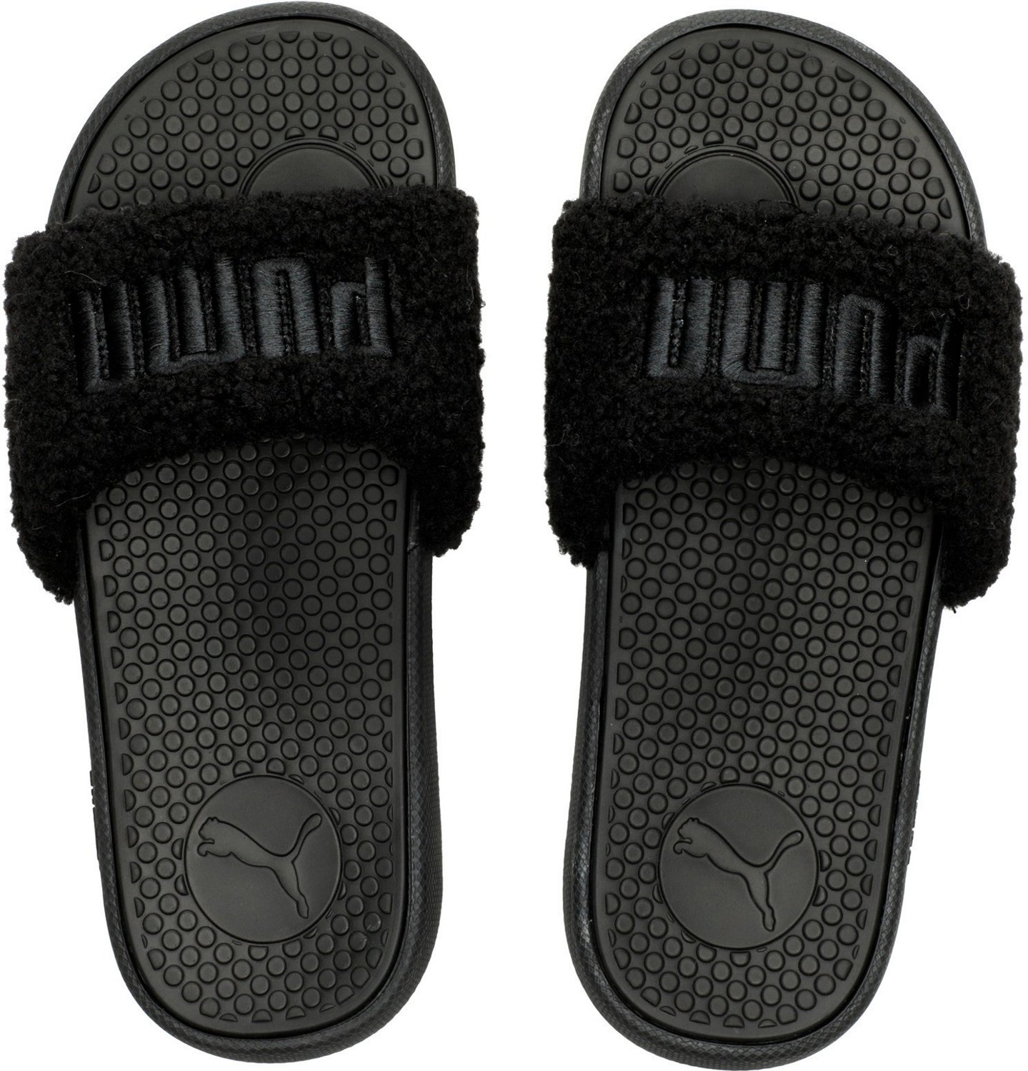 Stay comfortable all day with the PUMA Women's Sherpa Cool Cat Slides. These slides feature sherpa material uppers with PUMA embroidered branding for a cool and comfy look. The soft molded footbeds provide added comfort, while the light molded EVA outsoles allow for durability.