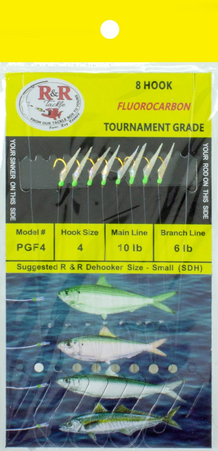 Designed to help you pull in pilchards, herring and more, the R&R Tackle Fluorocarbon Tournament Grade Sabiki Rigs 8-Pack offer corrosion-resistant hooks. The rigs provide fluorocarbon main lines and branch lines with swivels and snaps for dependable use.